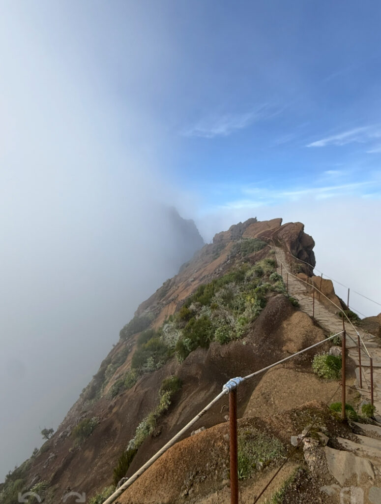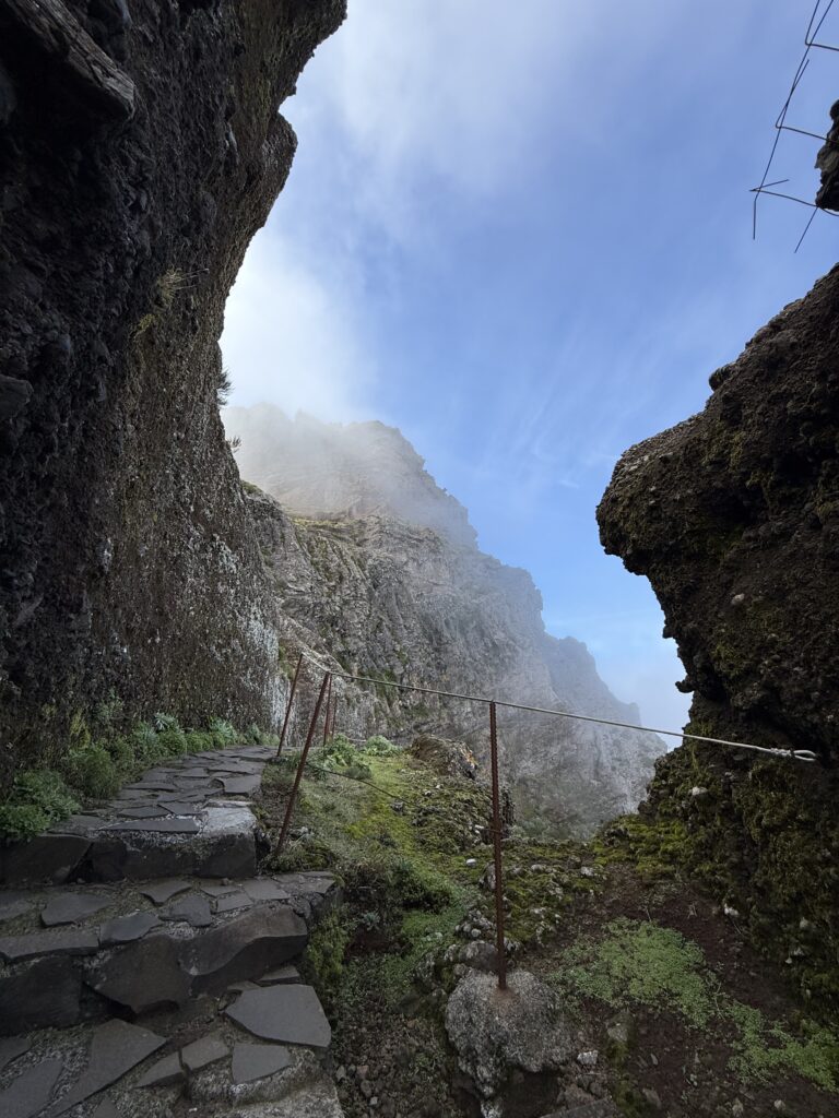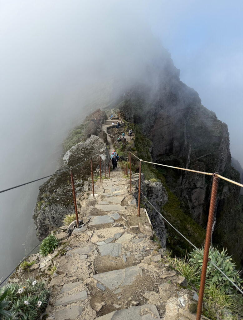 This dramatic section of the PR1 trail between Pico do Arieiro and Pico Ruivo is one of Madeira’s most unforgettable hikes. Narrow stone steps cling to sharp ridges, clouds roll in and out without warning, and the landscape shifts constantly beneath your feet. One moment you’re standing above endless valleys; the next, you’re walking through mist with only a few steps visible ahead.
